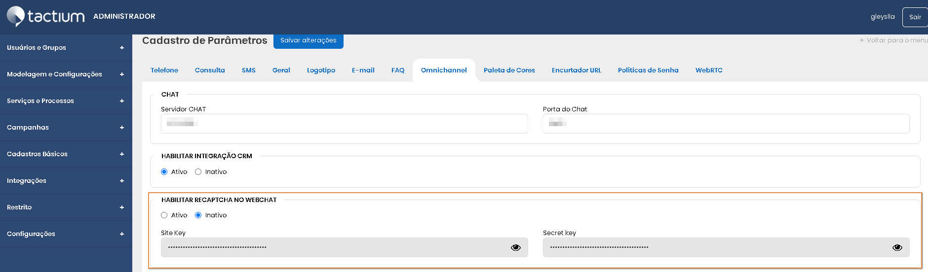 Habilitando e configurando os parâmetros do reCaptcha no WebChat