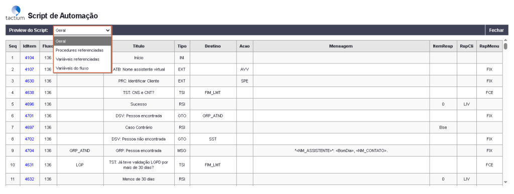 Variáveis do fluxo: lista todas as variáveis criadas ao longo do script.