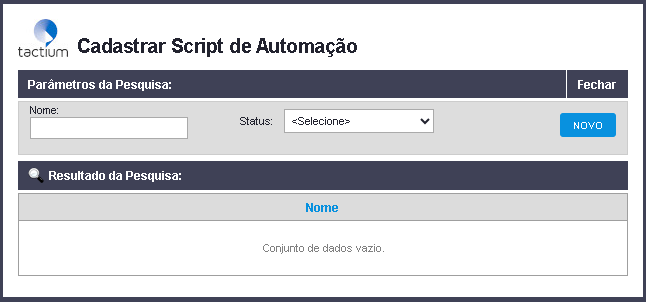 | Nome do Script * | Campo utilizado para nomear/renomear o script de automação, facilitando a identificação do mesmo na tela inicial. |