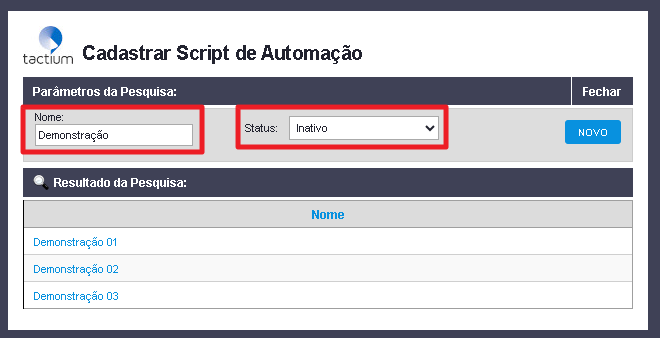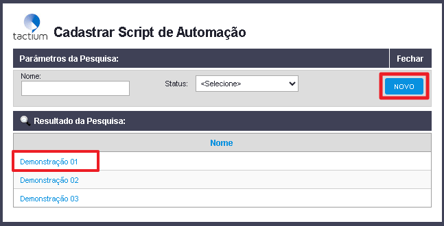 Nesta tela é possível filtrar e pesquisar por um script especifico, utilizando os “Parâmetros de Pesquisa”e clicando ícone em forma de lupa