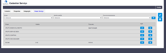 Como parte dessa implementação, foi adicionado um novo campo no cadastro de Serviço, dentro do ManagerADM, na aba “Grupo Serviço”, que permite definir o fluxo de transferência por grupo, sendo para o grupo cadastrado neste campo que será transferido o atendimento, com o nome “Fluxo de Encerramento”.