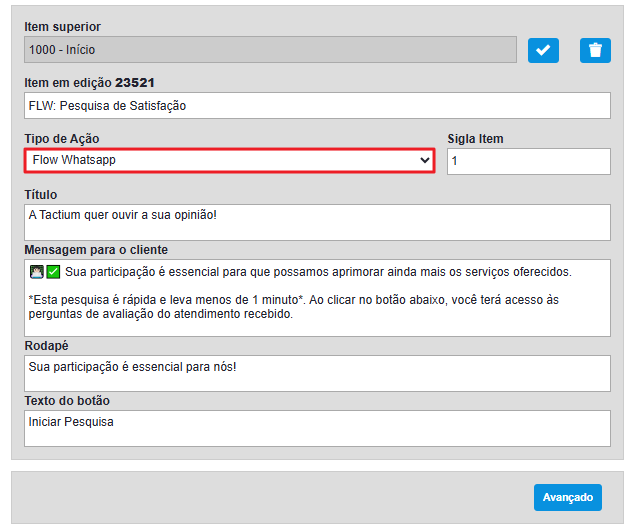 - O Botão “Avançado” dentro desse “Tipo de ação” serve para determinar o serviço e o grupo responsável para o qual o cliente será transferido.