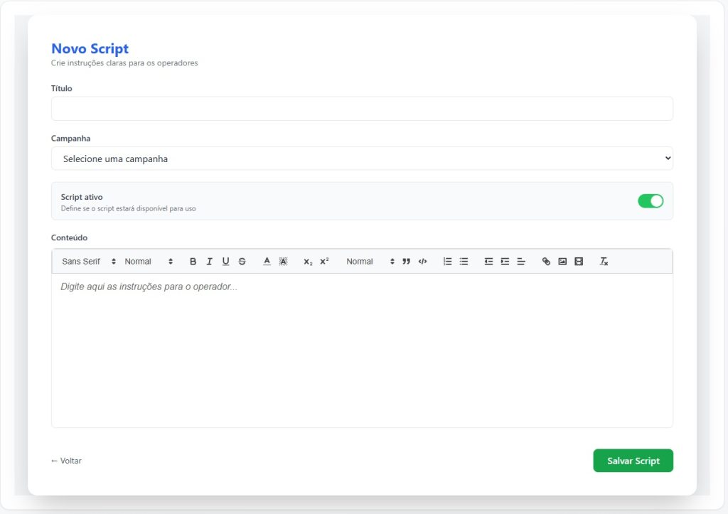 | Conteúdo | Área onde você escreve o script em si. Permite digitar o passo a passo do atendimento, inserir perguntas, adicionar objeções e respostas, além de formatar o texto (negrito, listas, etc.).
