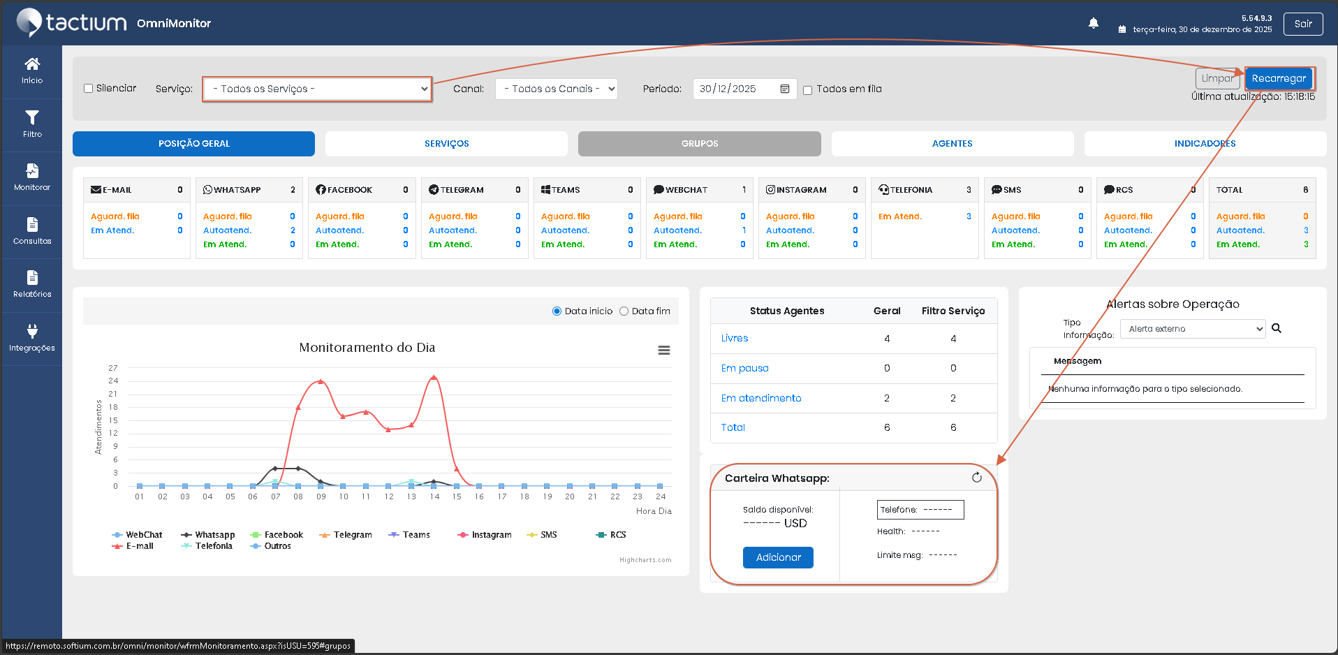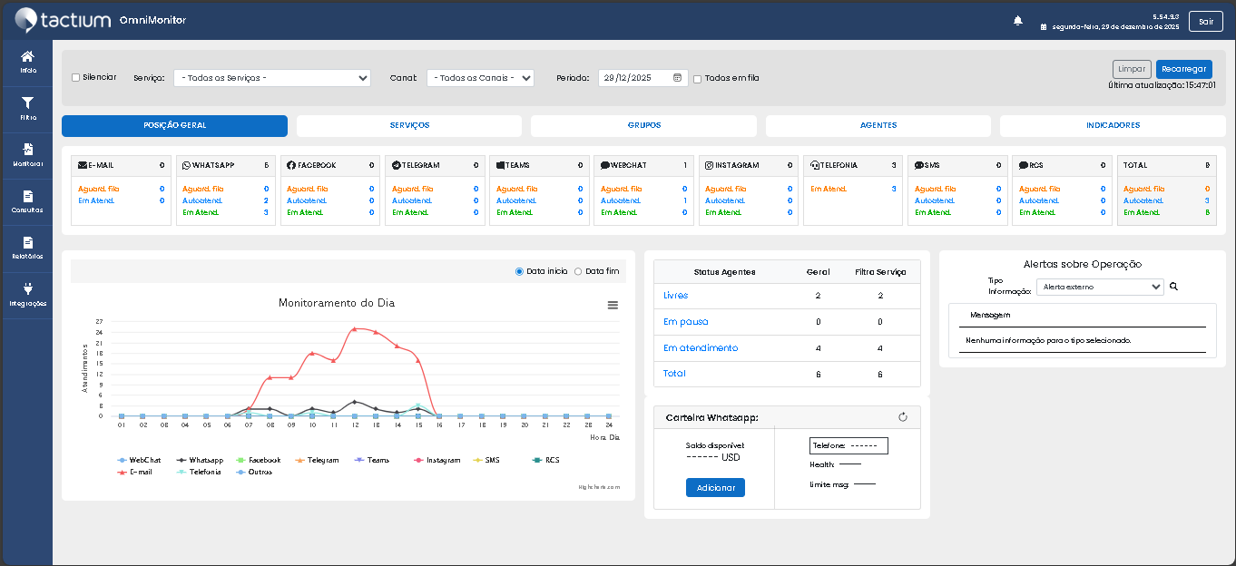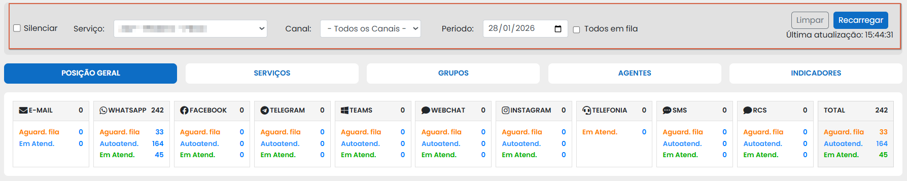 Importante ressaltar que o filtro de serviços e canais pode ser aplicada em qualquer aba (Posição Geral/Serviços/Agentes/Indicadores) da página inicial.