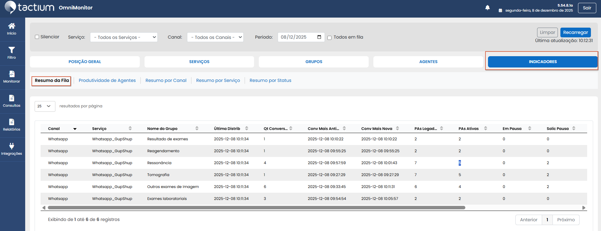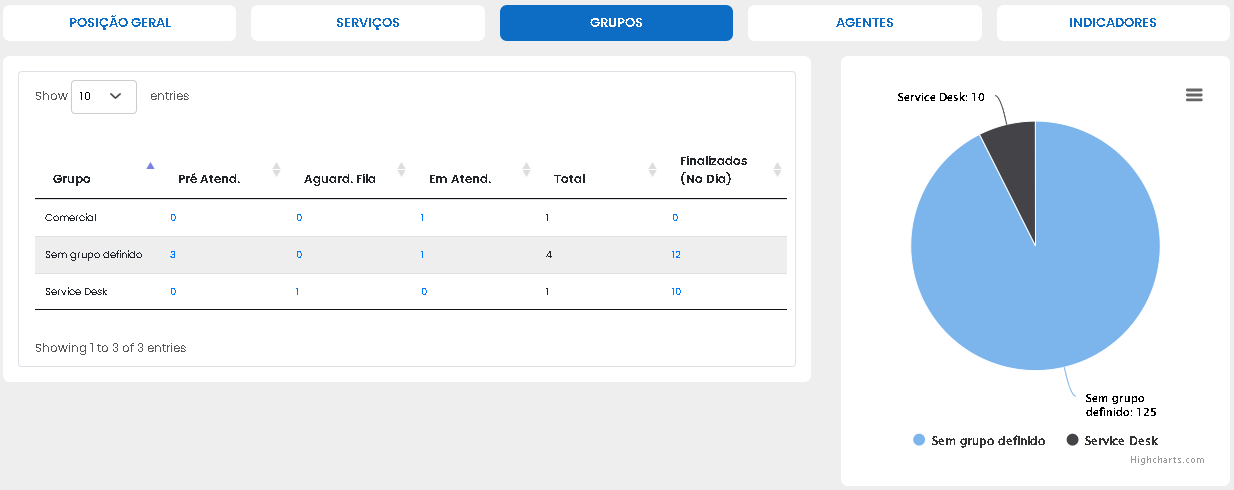 A aba “Grupos”, que permite acompanhar os atendimentos ainda pendentes, separados nas seguintes categorias: “Pré-Atend.”, “Aguard. Fila”, “Em Atend.” e “Total”.