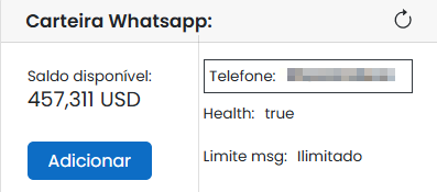 , porém para identificar o saldo disponível é necessário selecionar um serviço de WhatsApp e o saldo refletirá automaticamente.