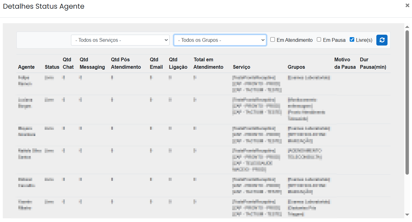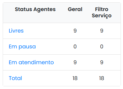 As colunas “Status Agentes” apresentará os status de cada agenda logado, “Geral” o total de agendes em cada uma dos status e “Filtro Serviço” o total de agentes no serviço filtrado, na parte superior da página.
