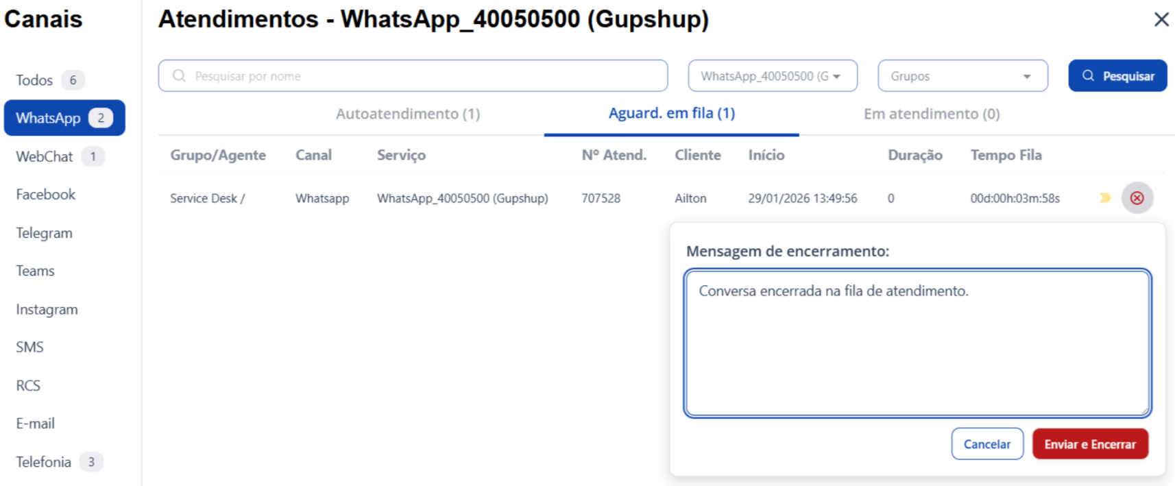 | Aguardando em Fila | O atendimento está em fila aguardando o início do atendimento. | Todos |