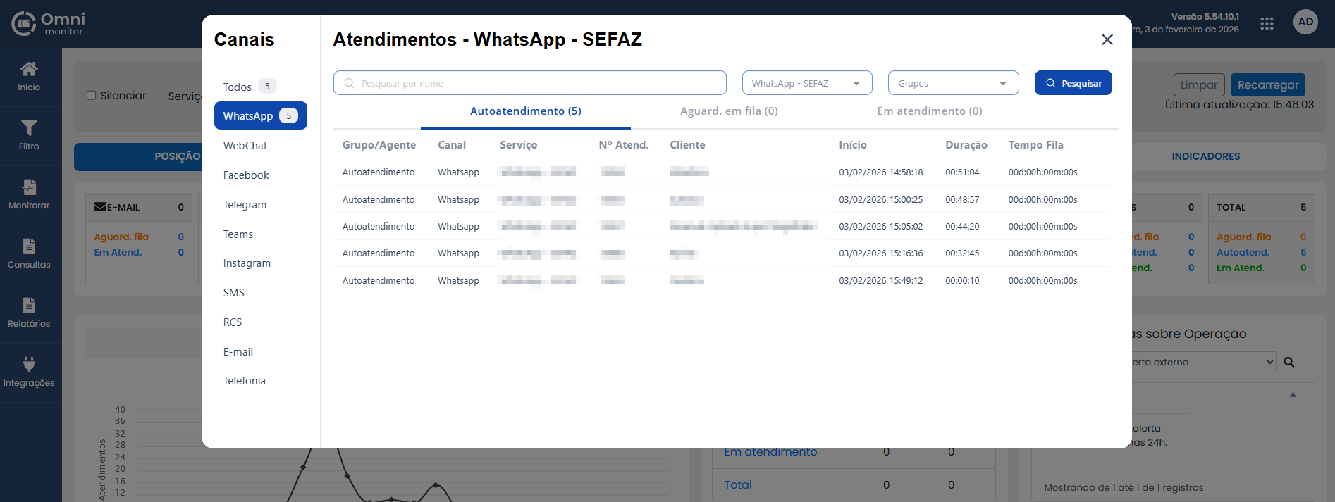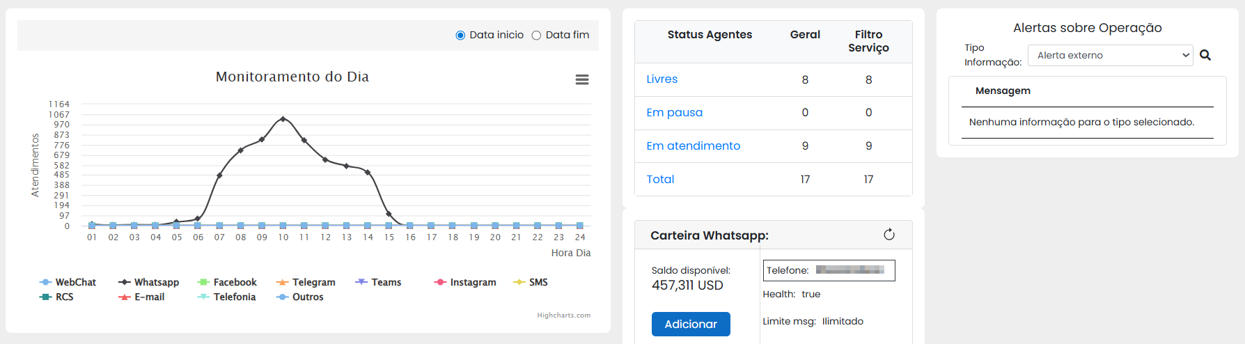 Na tela “Início” é realizado o monitoramento geral síncrono dos atendimentos de acordo com cada canal habilitado na plataforma.