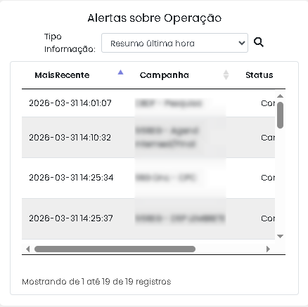 Essa funcionalidade permite o monitoramento da situação atual dos disparos e outras informações relevantes da operação, por meio dos seguintes tipos de alertas: